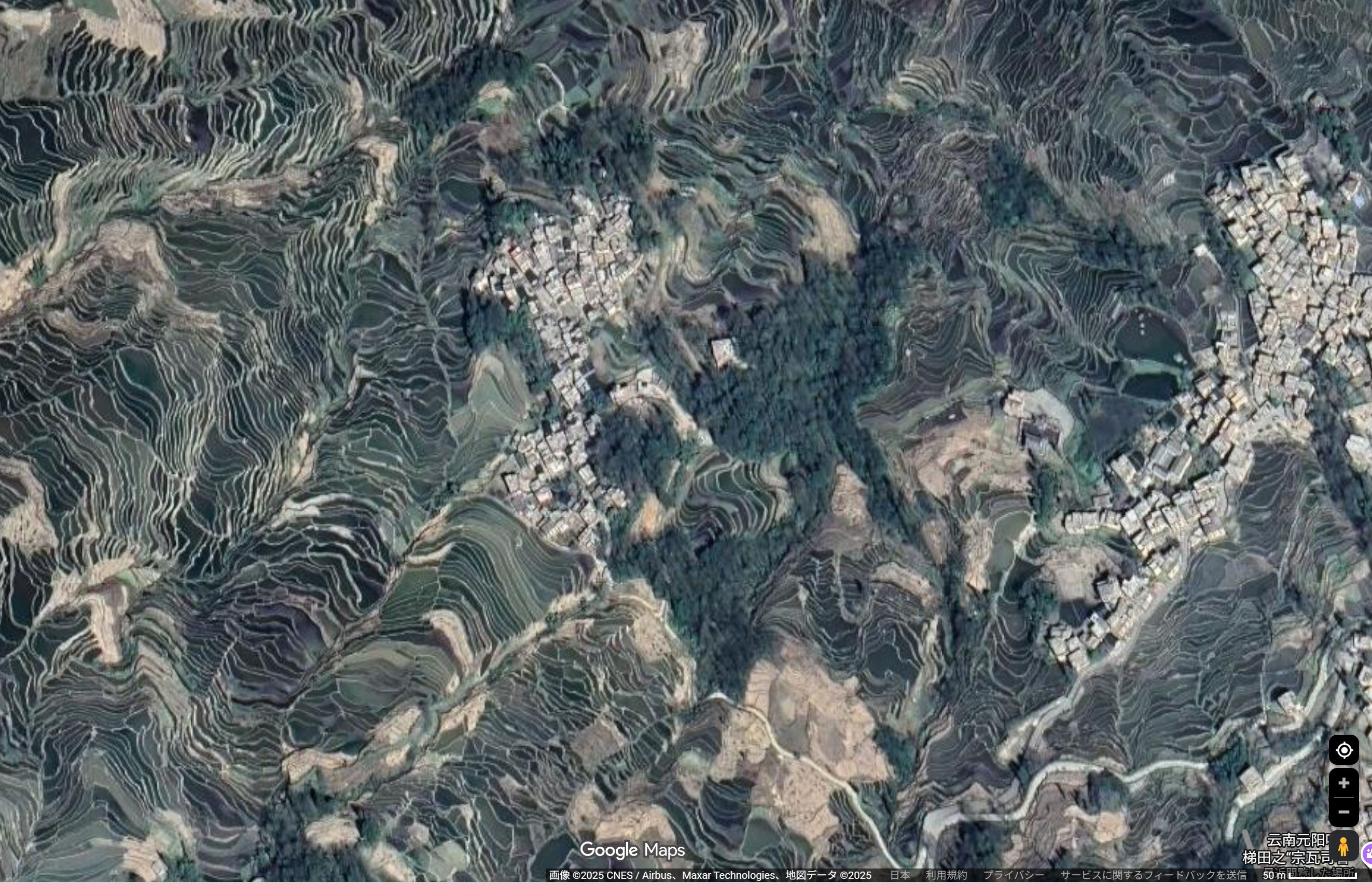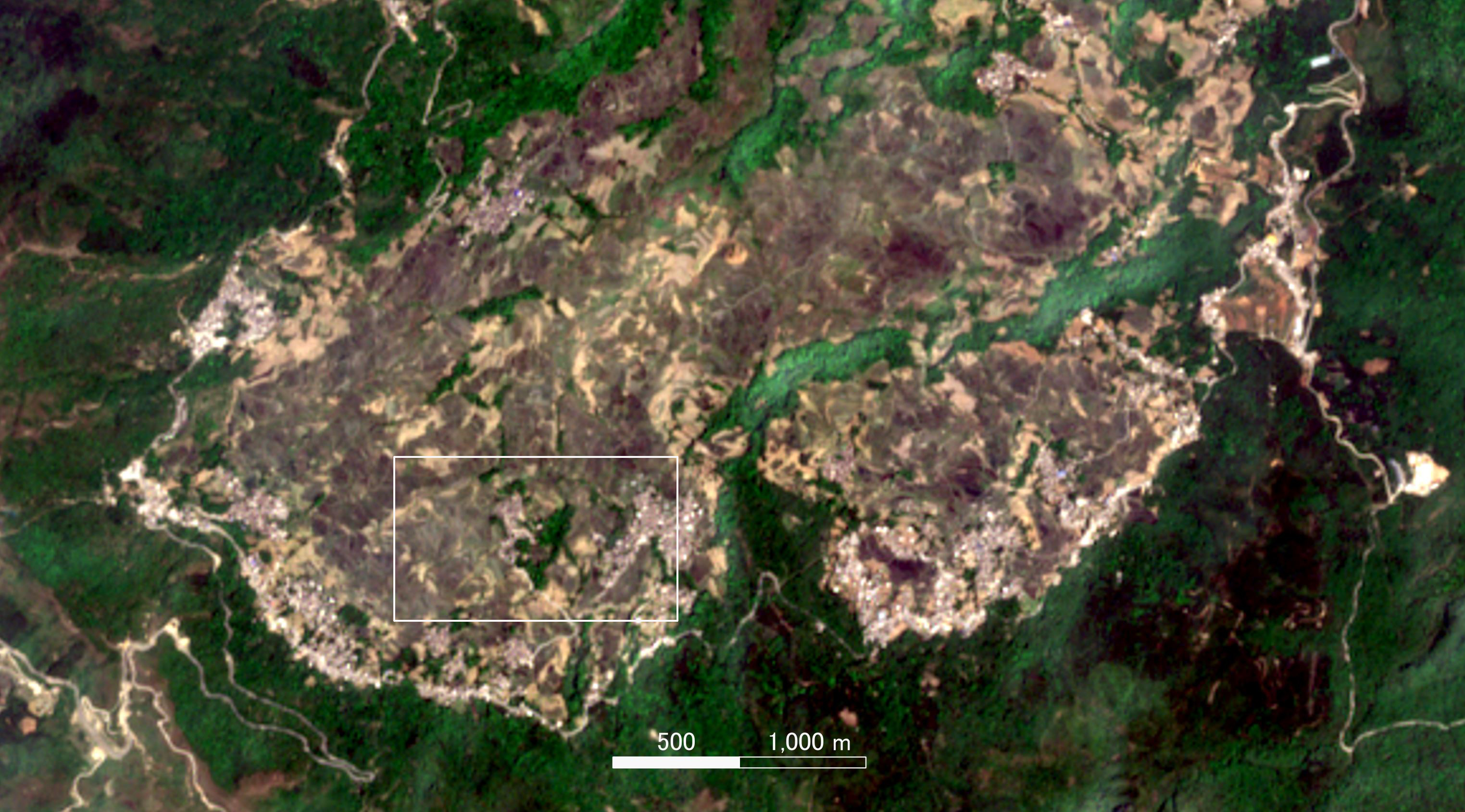 | 画像4 多依樹集落(画像3参照)のナチュラルカラー画像.枠は画像5の範囲を示す. | 画像5 Google Map 衛星画像で見た棚田 画像の範囲,幅約1Km |