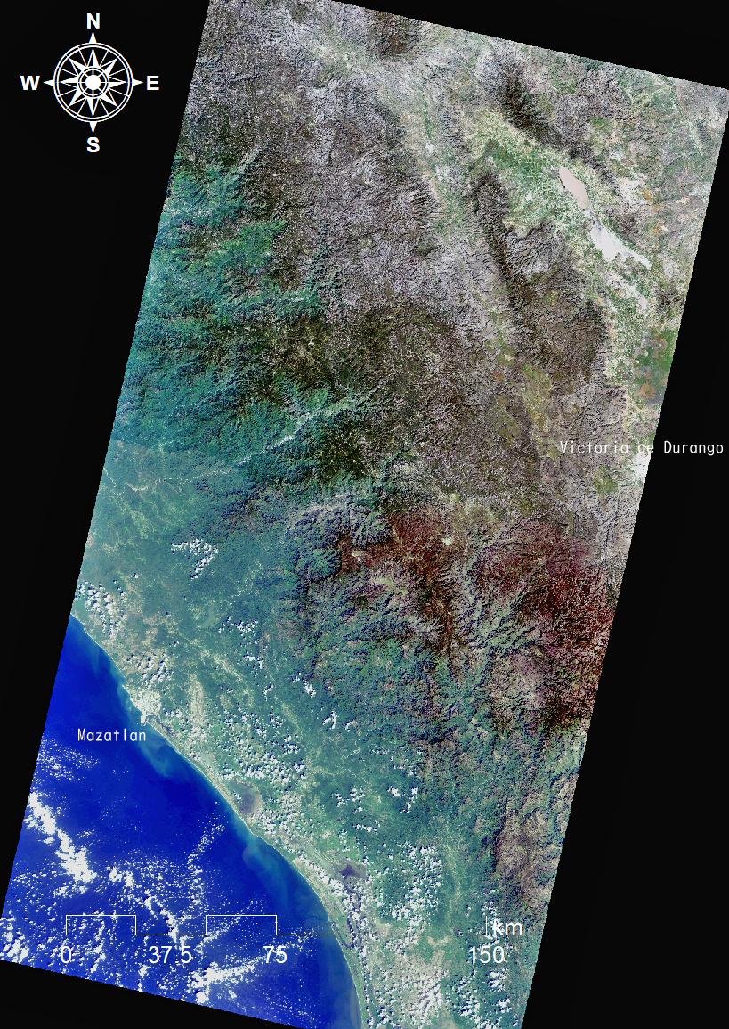 | 2月はバハ・カリフォルニア半島南端のシエラ・デ・ラ・ラグナ山脈を取り上げた。この半島の対岸にあるメキシコ北部には、北西から南東にかけて連なる大山脈がある。山脈の西側はアメリカ合衆国のシエラネバダ山脈から続く西シエラ・マドレ山脈があり、中央部にはメキシコ高原がのび、東側はロッキー山脈がメキシコ湾沿いに南下する東シエラ・マドレ山脈が並走する。この両山脈が合流した所に東西に長くつらなる南シエラ・マドレ山脈がある(図1)。この3つの山脈をまとめてシエラマドレ山脈とよぶ。 画像はこれらのうち、西シエラ・マドレ山脈の一部をとらえている(画像1、2)。西シエラ・マドレ山脈は、スペイン語で「母なる山」を意味するという。『この山脈はメキシコ高原の西縁にあり、カリフォルニア湾と太平洋に沿って,アメリカ合衆国との国境付近から南東へ約 1200kmにわたって延びる。幅は 150〜400km。平均標高約 2000mで,中部には 3000m以上の高峰もいくつかそびえる。東側は標高 1000m以上のメキシコ高原に続くため,比高があまり大きくならないが,西側斜面は狭い海岸平野に向って急傾斜をなし,けわしい山容を示す(ブリタニカ国際大百科事典による)』。山脈のところどころはリオグランデデサンティアゴ川などによって深くきざまれた深さ1000m以上の渓谷があり、その規模はグランドキャニオンに匹敵するという。 |