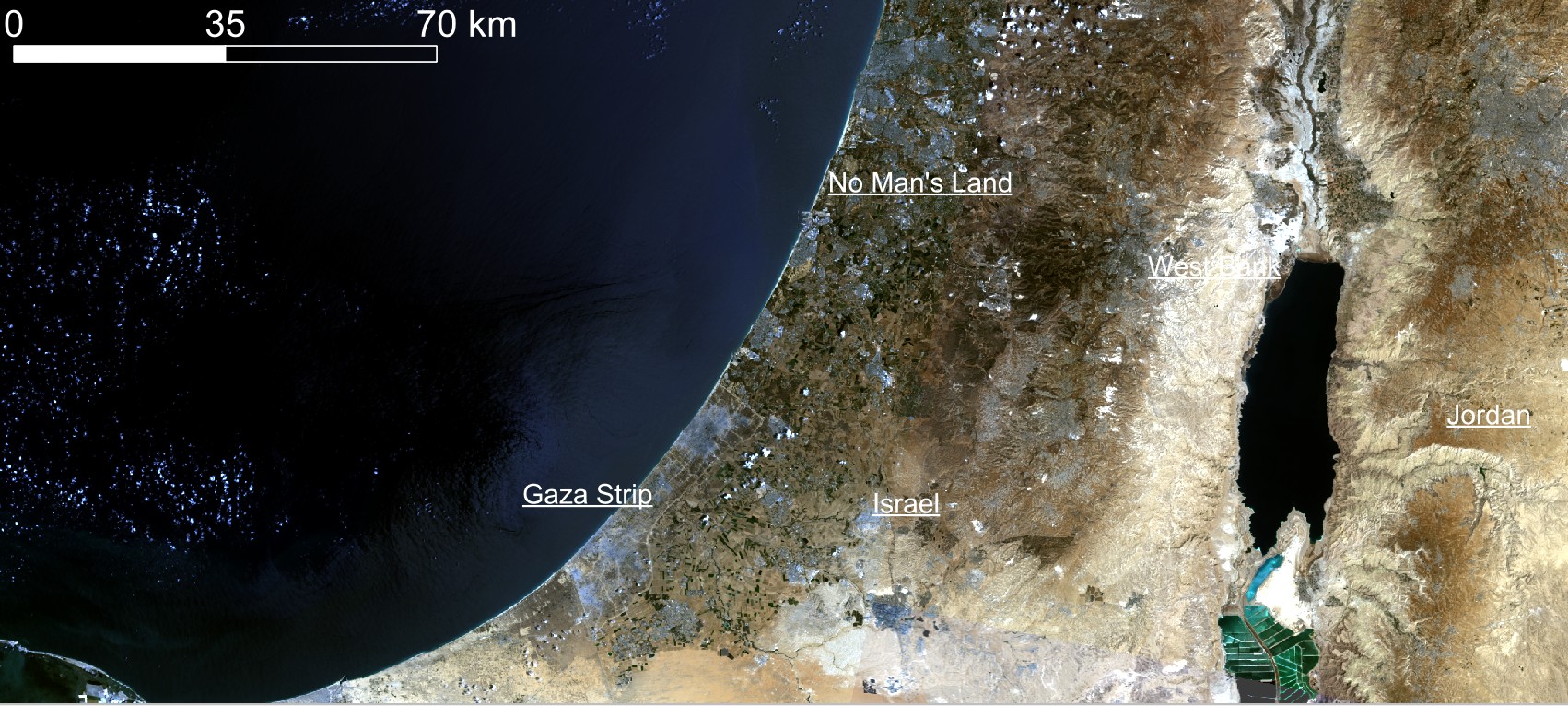 画像1 ガザ地区(画像の左端)とヨルダン川西岸地区の南部(画像の右端) SENTINEL2 2025年9月16日 RGB:432 | ||