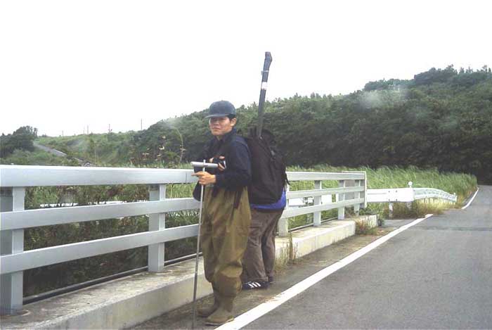 ボーリングの道具を背負ってこれから川に入ります。