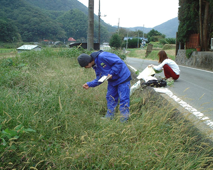 農村集落の路傍雑草群落の調査.農村にも多くの帰化植物が繁茂している.