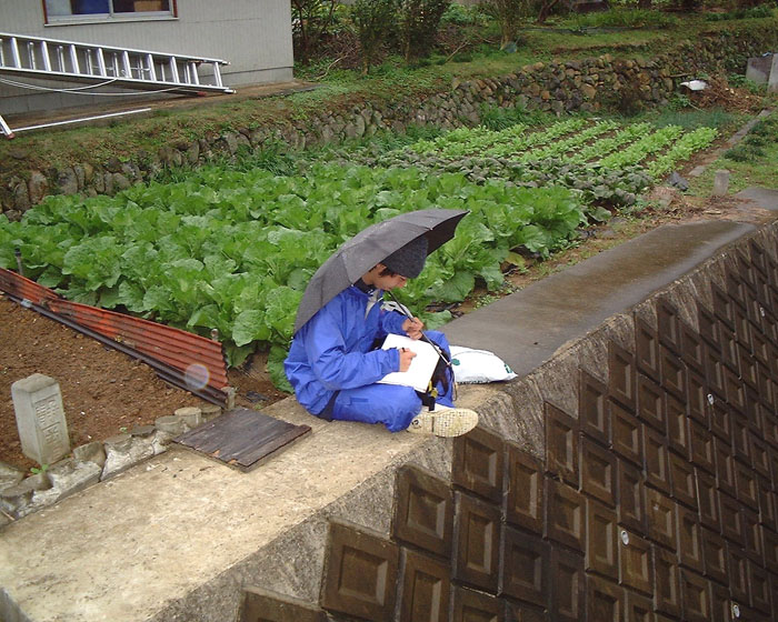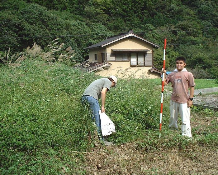 農村地帯の雑草群落(畑の跡地)の調査風景(静岡県南伊豆町青野)