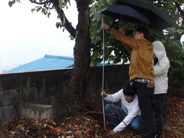 佐々木ゼミの12名は,広島県呉市を中心とする地域で気象観測と大規模土砂移動現象の調査を行いました。気象観測では,呉市における都市気候とそれに与える海陸風の影響を明らかにするために,定点での気温・湿度の観測と移動観測による気温および風向・風速の観測を行いました。また,本年7月の豪雨によって発生した大規模な土石流の実態やそれがどのような地形・地質条件のもとに発生したのかを調査しました。これに関連して,2014年の豪雨によって広島市安佐南区で発生した土石流の発生域を観察しました。 |