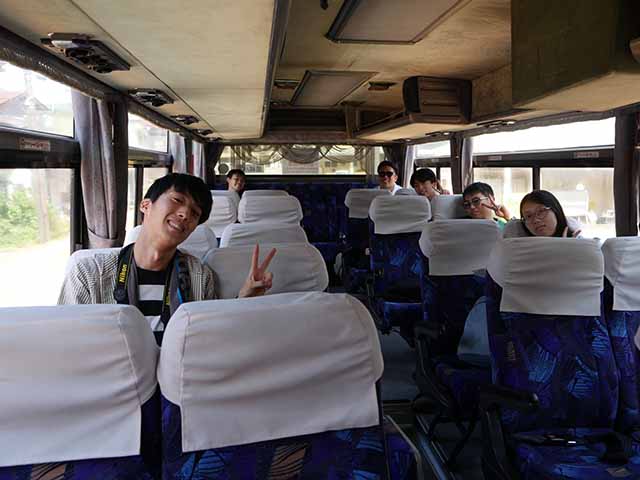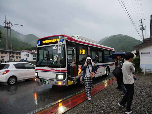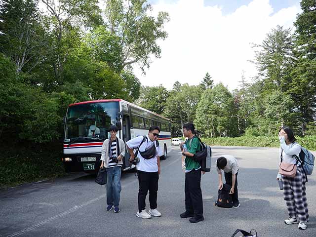 | 01 会津田島駅に集合してバスで沼山峠へ! | 02 貸し切り状態のバスで沼山峠に到着 |