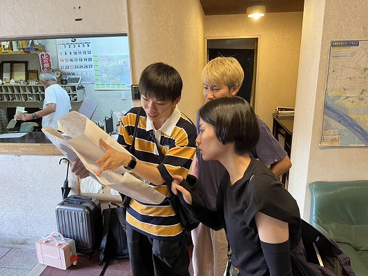 | 1日目の朝、宿泊先に集合です。 | 出発前の作戦会議。 |