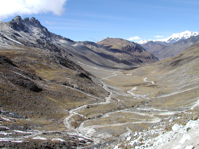 写真1 標高4,730 mのワヤワヤ(huaylla huaylla)峠付近は,氷食高原となっている。浅い圏谷には氷河湖がみられ,湖岸ではリャマやアルパカの放牧が行われている。 |