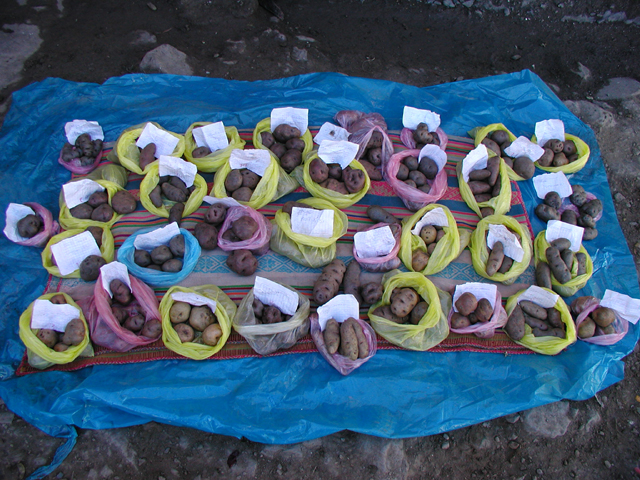 写真4 ワヤワヤ峠から少し下って,標高4000mくらいから標高3000mくらいまでの高度帯にはジャガイモの耕地が広がる。先住民は耕地周辺に出作り小屋を設け,栽培方法や収穫期を異にする多様な品種を栽培している。 |