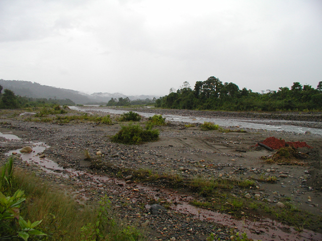 | 写真11 キンセミルを流れるアラス川は,扇状地を開析して網状に流れ,広い氾濫原をつくる。キンセミルの年平均気温は約22℃,年降水量は6000mm以上であり,植生は熱帯雨林の様相となる。 | 写真12 キンセミルにみられる住居は,高温多湿環境を考慮して高床式の住居になっている。この地域では入植者によってコーヒー栽培やバナナの栽培が行われている。 | |||
