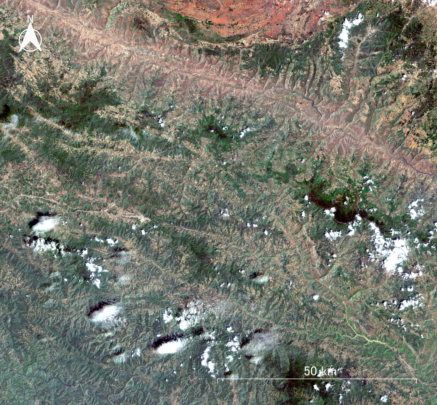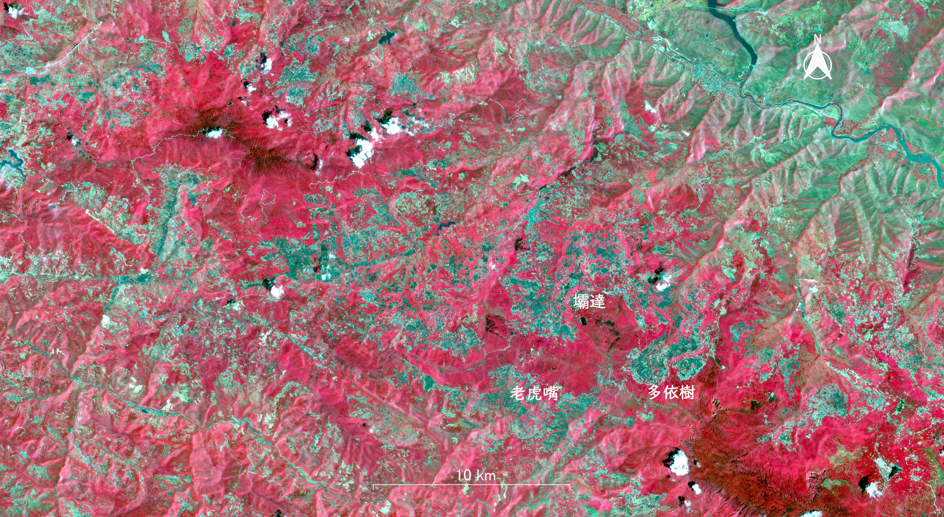 | 画像1 元陽県にあるハニ族の棚田が分布する山岳地域 SENTINEL 2 2025年4月 ナチュラルカラー画像 | 画像2 画像1 と同じデータから作成した擬似カラー画像 枠は画像3の範囲を示す |
