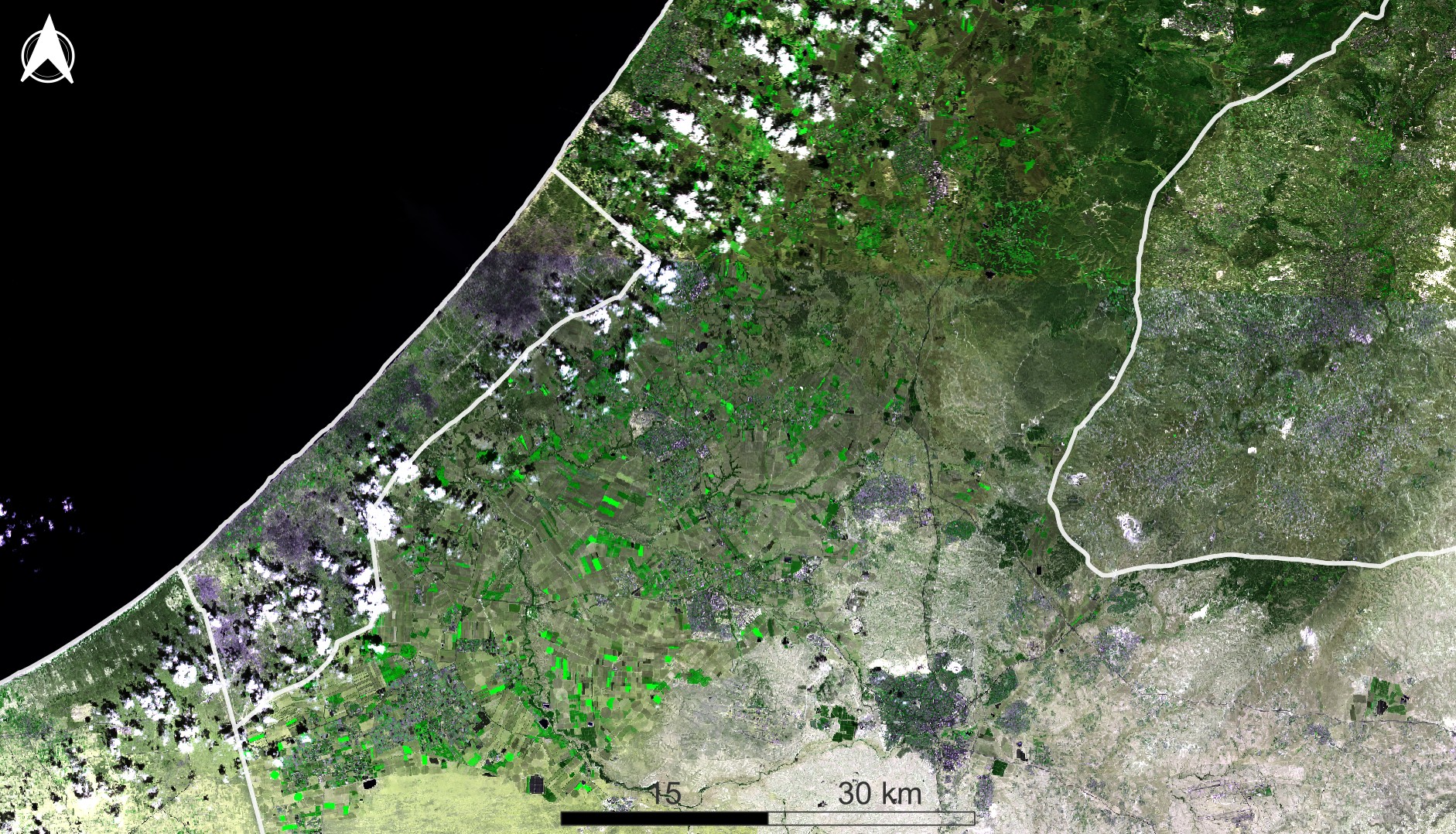 画像1 ガザ地区(画像の左端)とヨルダン川西岸地区の南部(画像の右端) SENTINEL2 2025年9月16日 RGB:432 | ||