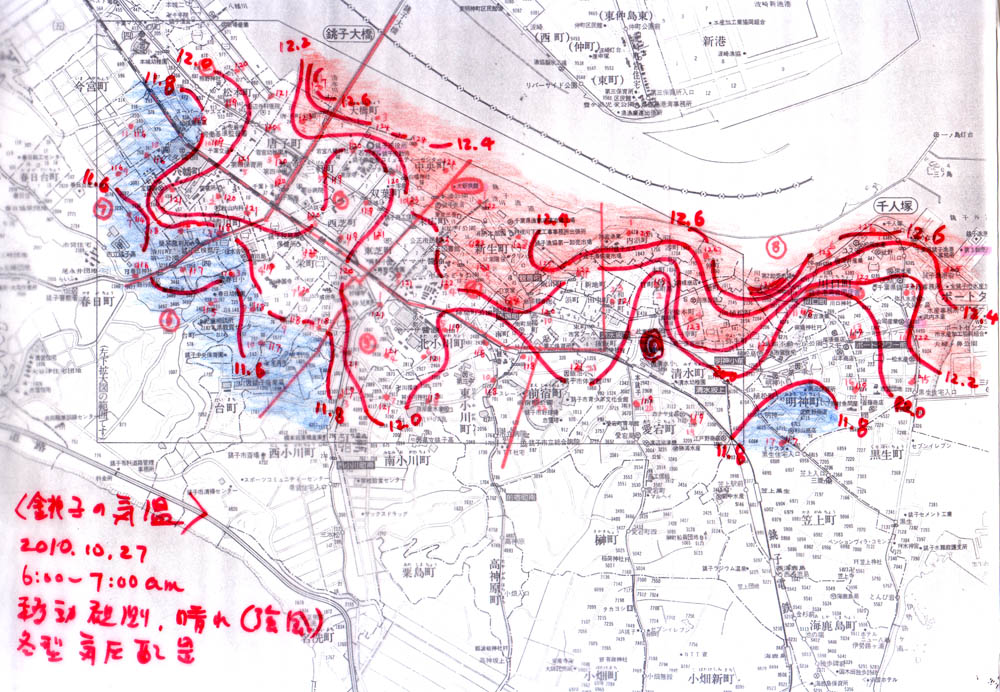 | 宿舎での夕食風景。毎晩、食べきれないほどのごちそうだった。 | 早朝の気温観測。徒歩と車の移動観測によって描かれた気温分布は、都市よりも利根川の影響の方が顕著に出た。気象台は図の右端、真ん中辺が銚子駅、上の空白部が利根川。右が河口。 |