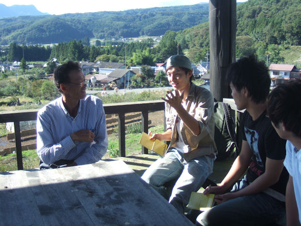 | 宮田さんを囲んで.男子学生12名の「ノリ」は過去4年とは違いました(汗) | 2日目は晴天の中,中野集落の土地利用調査を実施. | ||