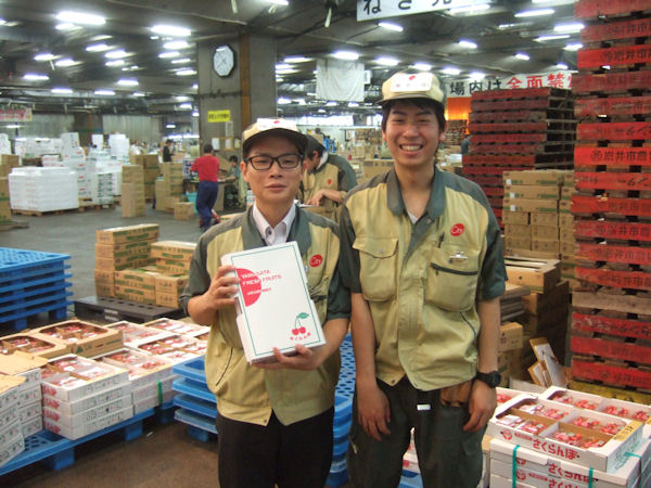 | 今回の見学では、宮地ゼミの卒業生である関根悟君(2011年度卒・総務課所属)も案内者の一人としてお世話になりました。 | 高級果実も並びます。スイカ、マンゴー、さくらんぼ(桜桃)、、、おいしそうです。 | |