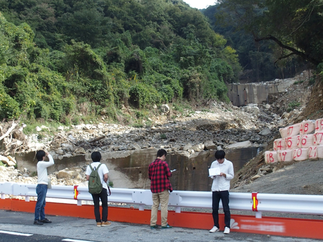 佐々木ゼミの12名は,広島県呉市を中心とする地域で気象観測と大規模土砂移動現象の調査を行いました。気象観測では,呉市における都市気候とそれに与える海陸風の影響を明らかにするために,定点での気温・湿度の観測と移動観測による気温および風向・風速の観測を行いました。また,本年7月の豪雨によって発生した大規模な土石流の実態やそれがどのような地形・地質条件のもとに発生したのかを調査しました。これに関連して,2014年の豪雨によって広島市安佐南区で発生した土石流の発生域を観察しました。 |