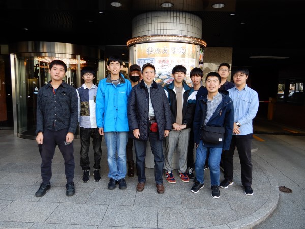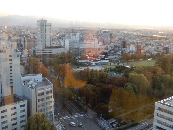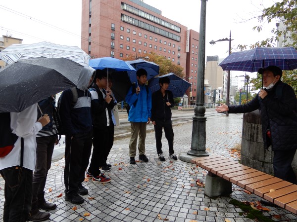 | 富山市役所展望台から富山城址等の中心市街地を臨む | 宿舎のホテル前で富山の都市変遷の説明を聞く |