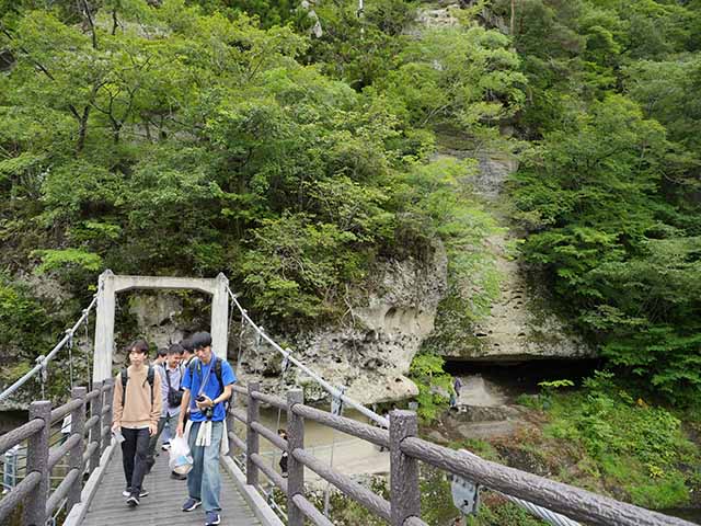 | 13 阿賀野川上流「塔のへつり」のつり橋にて | 14 その後は雑木林を歩いて風穴へ |