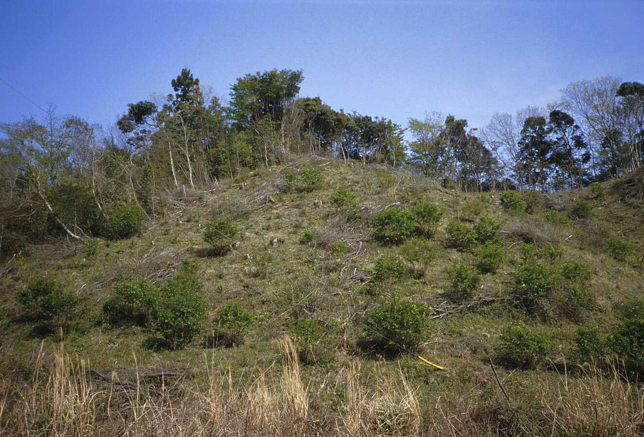 このような常緑広葉樹林は,関東平野などの社寺林でみられるような自然林ではありません.これらは,昭和30年代の燃料革命以前は15〜20年前後の周期で定期的に伐採され,薪炭用材採取などの目的で利用されてきた雑木林(二次林)です.写真2は,1985年の段階でまだ伐採利用が続けられていた林の,伐採から1〜2年後の様子です.写真中央に点々とみられる緑は,伐採後の切り株から何本もの常緑広葉樹の枝が成長したものです.