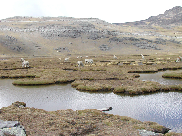 写真1 標高4,730 mのワヤワヤ(huaylla huaylla)峠付近は,氷食高原となっている。浅い圏谷には氷河湖がみられ,湖岸ではリャマやアルパカの放牧が行われている。 |