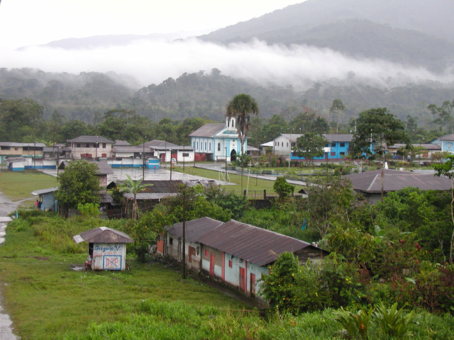| 写真11 キンセミルを流れるアラス川は,扇状地を開析して網状に流れ,広い氾濫原をつくる。キンセミルの年平均気温は約22℃,年降水量は6000mm以上であり,植生は熱帯雨林の様相となる。 | 写真12 キンセミルにみられる住居は,高温多湿環境を考慮して高床式の住居になっている。この地域では入植者によってコーヒー栽培やバナナの栽培が行われている。 | |||