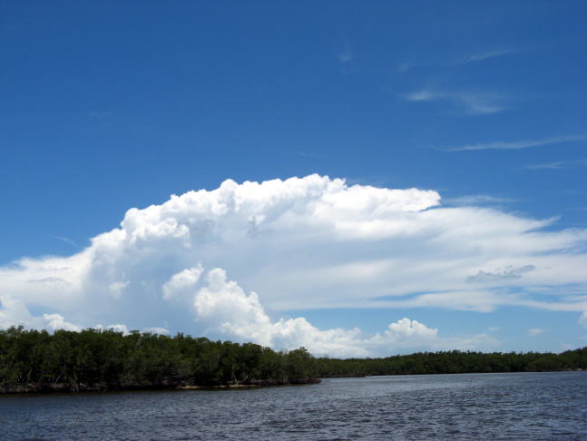 ところで、エバーグレーズ大湿地はかつて、オキチョビー湖からフロリダ半島の先端まで続いていました。1800年代の地図を見ると、湖の北にも広い湿原があったようです。今では、オキチョビー湖の南はエバーグレーズ農業地帯に、東の境界部はマイアミなどの市街地が広がり、エバーグレーズはかつての半分の面積に縮小してしまいました。 また、湿地内の水質やメキシコ湾岸の海水の汚染も進んだそうです。エバーグレーズの西端にあって、メキシコ湾に臨むTen Thousand Island 周辺も例外ではなく、海洋が汚染されたようです。この島々にはマナティが生息していますが、その数もずいぶん減少したといわれています。湿地やその周辺で汚染が進んだ理由は、1900年代後半からリゾート地として開発が進んだこと、ハリケーンのたびに氾濫を繰り返すオキチョビー湖の水害を抑えるため、何本もの水路を建設され、乾燥化や湿地内の水の流れが変わってしまったこと。また、増え続ける人口と農地の拡大により、家庭からの生活廃水や農薬などの有害物質が水路を通って、一気に流れ込むようになったことなどによると考えられています。それにともない生息していた植物、動物、鳥類の多くが姿を消しました。周辺の海域は赤潮などが頻発し、生態系への影響も大きかったといいます。