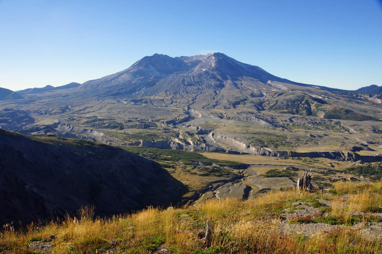 | この火山は1980年に大噴火を起こし、山体が大規模に崩壊した。被害の大きさもさることながら、一部始終が動画で撮られていたため今でも自然災害の特集番組では繰り返しこの映像が流される。 この時の噴火では、「57人が亡くなり、鉄道は24km、高速道路は300kmにわたって破壊された。さらにセント・ヘレンズ山の山頂部分は大規模な山体崩壊によって直径1.5kmにわたる蹄鉄型の火口が出現し、山の標高は2,950mから2,550mに減少した。」ウィキペデキアによる。アメリカワシントン州にあるこの火山は、北米大陸の太平洋岸を南北に走るカスケード山脈の中央やや北よりの部分にある。カスケード山脈は、太平洋を囲むFire Ringに位置しており、北米で発生した歴史的火山噴火はほぼカスケード山脈の火山で起こっている。最後の2枚の写真は、当地を撮影した写真で、立正大学の鈴木厚志先生からお借りしたものである。 |