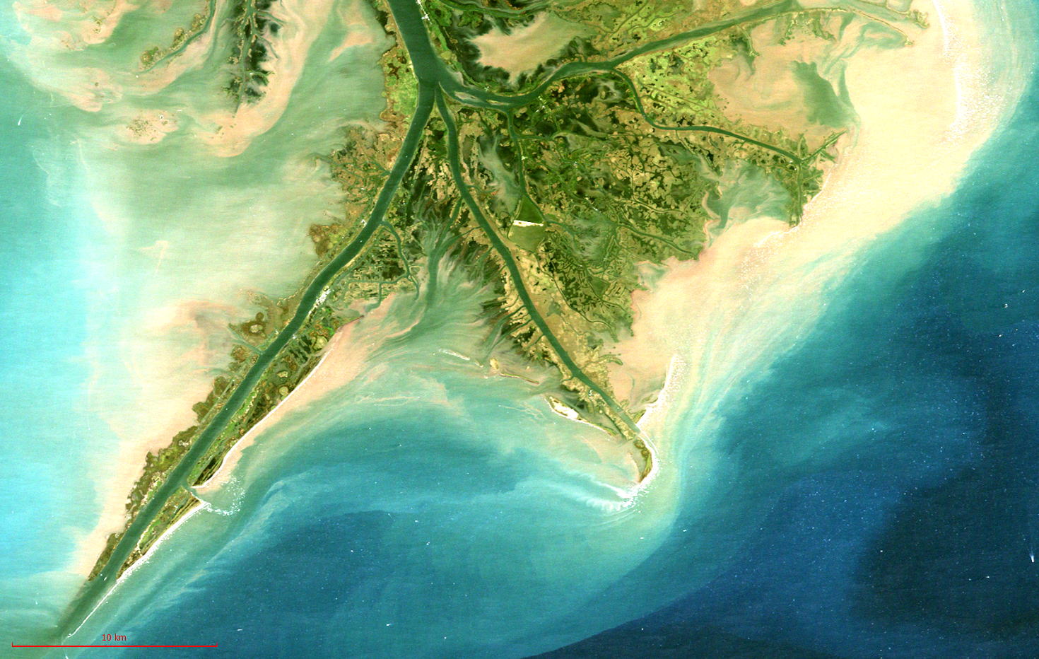 画像4 2001年のLandsatTMでみたミシシッピデルタ(スケールは30km)。