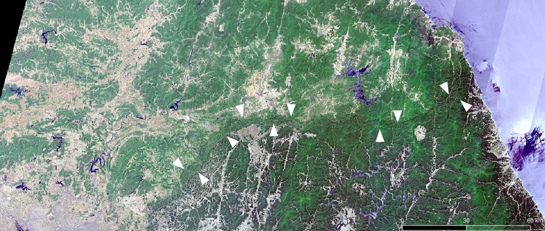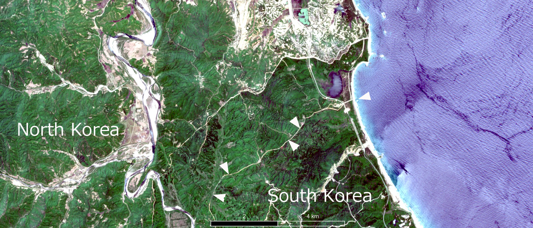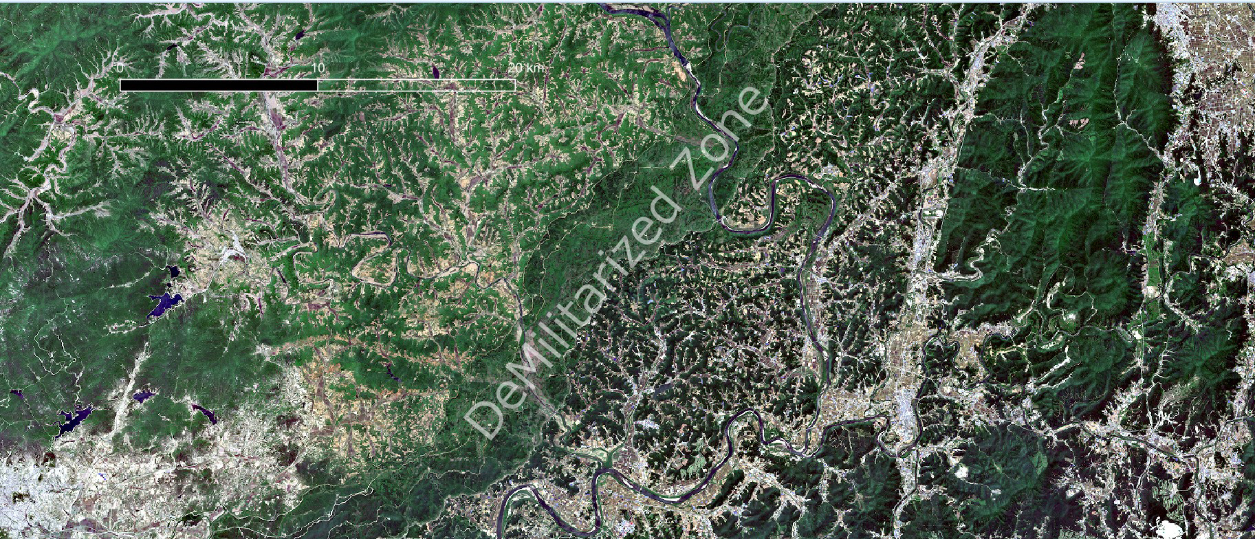 | 画像1 朝鮮半島の北緯38度付近を横断する画像 SENTINEL2 2025年6月6日の画像を接合 RGB:432 矢印の間がD.M.Z.(DeMilitarized Zone;非武装地帯) |