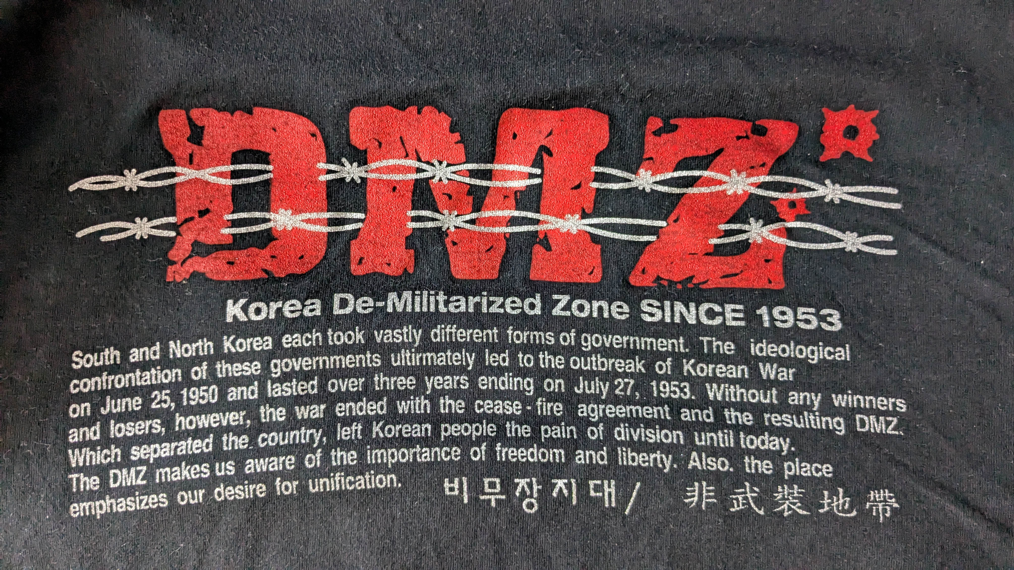 Tシャツにプリントされた文章 : 1953年以来の韓国非武装地帯 |