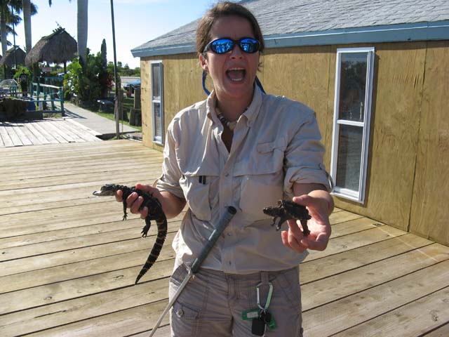 写真1 エバーグレーズの観光エコツアー  パーク・レンジャー風の案内人は大学の生物学科卒業だそうです 写真2 大きなバッタ
