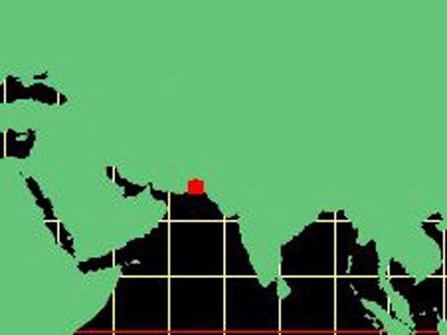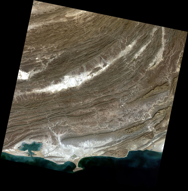 | 画像は、ザクロス山脈に続くマクラーン山脈を捉えている。イランとパキスタンの国境付近にあたる。 この地域は、バルーチスターン(Baluchistan)ともよばれ、中央アジア南部に位置する歴史上重要な地方である。アラビア海に面し、パキスタン南西部のバルーチスターン州、およびイラン南東部とアフガニスタン南部の隣接部をふくむ地域である。海沿いの沖積低地は狭く、ほとんどが岩の多い乾燥した高原が東西方向の構造線に影響を受けて分布し、砂漠と不毛な平原が広がる。降水量は少なく植物はほとんどそだたない。画像で緑色っぽく見えるものがあるが、植生を反映したものではない。 |
