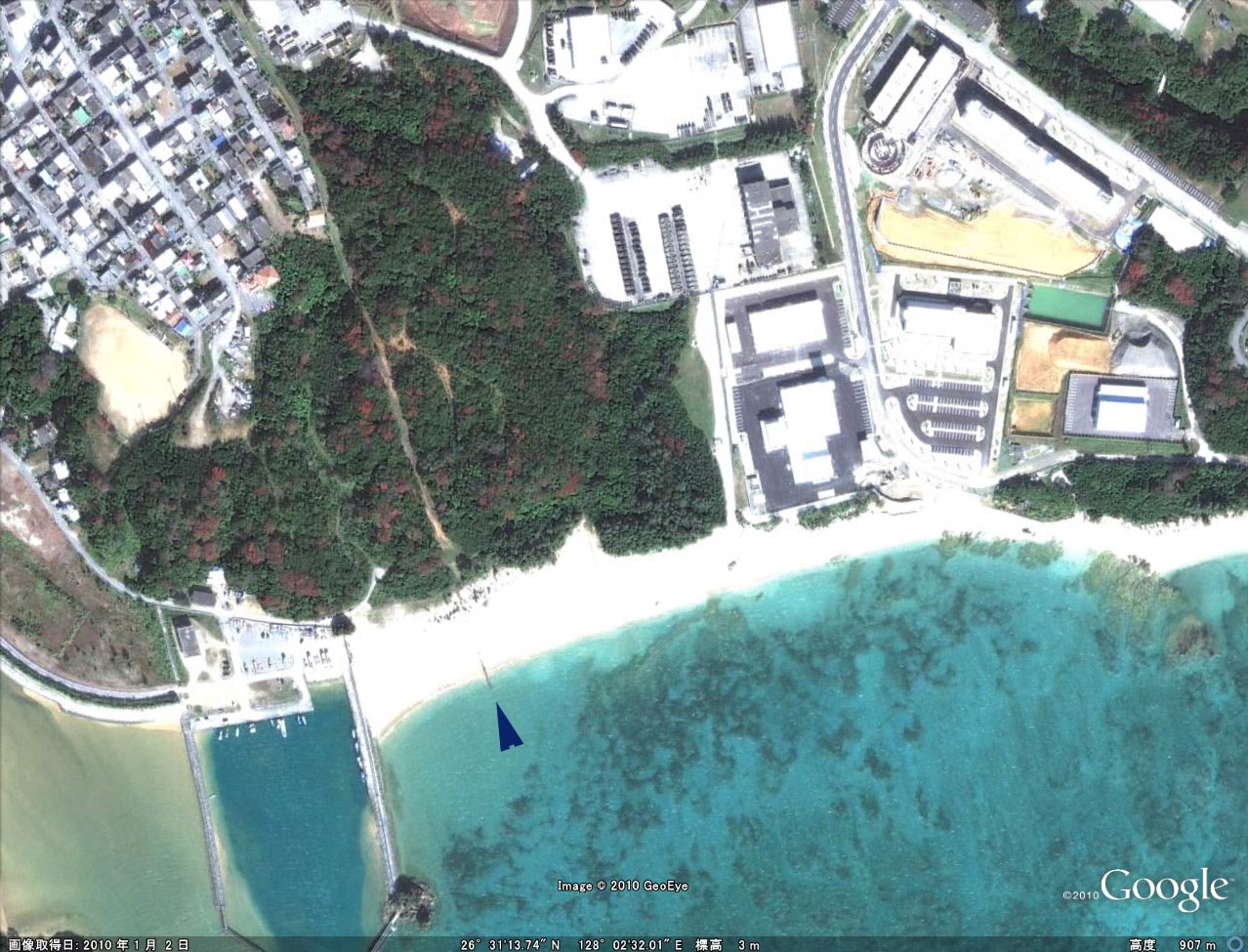 | 画像2 グーグルアースでみた辺野古海岸 矢印の先にキャンプシュワブとの境界がみえる 右側が基地 | |||||