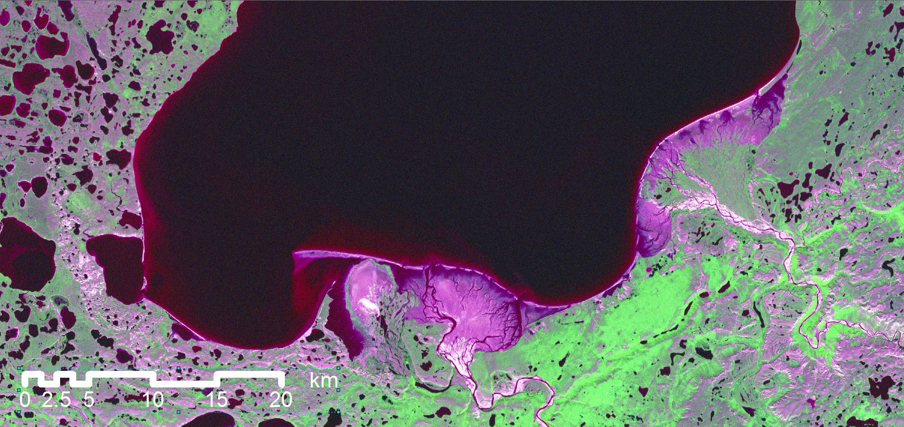 カナダ北端のボーフォート海、アムンゼン湾(地図1)に沿う海岸部を捉えた夏のLandsat画像が画像1である。中央のペリー半島の東側はダーンリー湾という。この湾を挟んで形状の異なる湖沼群が見える。画像2の北東の部分に見える並行にのびる細長い凹みと高まり、その凹みにつくられた湖沼は、基盤岩が氷床での底で削られた凹みと氷食湖である(画像3)。いっぽう西のペリー半島やその基部に見られる円形を主とする湖沼群は、凍土地域にできたサーモカルスト(解氷)湖である(画像4)。サーモカルスト湖の成因は、氷床が後退した後に地中に取り残されてていた氷が融けたり。永久凍土が融解と凍結を繰り返すうちにつくられた凹地がもととなってできた湖である。サーモは熱を意味しているし、カルストは石灰岩地帯に見られるカルスト地形に似ていることからそのようによばれたものだ。ボーフォート湾に沿うこの地域の低地は、このシーンに限らずサーモカルストによる湖沼群が無数に分布する地域である。環境の変化によって、これらの湖沼群は数を増やすことになるのだろうか。 |