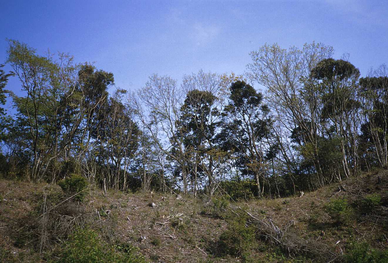 このような常緑広葉樹林は,関東平野などの社寺林でみられるような自然林ではありません.これらは,昭和30年代の燃料革命以前は15〜20年前後の周期で定期的に伐採され,薪炭用材採取などの目的で利用されてきた雑木林(二次林)です.写真2は,1985年の段階でまだ伐採利用が続けられていた林の,伐採から1〜2年後の様子です.写真中央に点々とみられる緑は,伐採後の切り株から何本もの常緑広葉樹の枝が成長したものです.