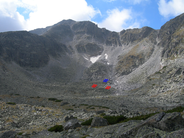 写真6 上位の圏谷には岩石氷河がみられる(赤矢印)。岩石氷河は新ドリアス期の氷河が後退したあと,8000年前ころまでに形成されたと考えられる。青矢印で示した高まりは8000年前ころの氷河前進によってつくられたモレーンであり,岩石氷河は氷河末端より下方にあった。なお,最近圏谷壁の一部が崩壊し,岩屑がモレーンの上端に達したらしい。 | |||