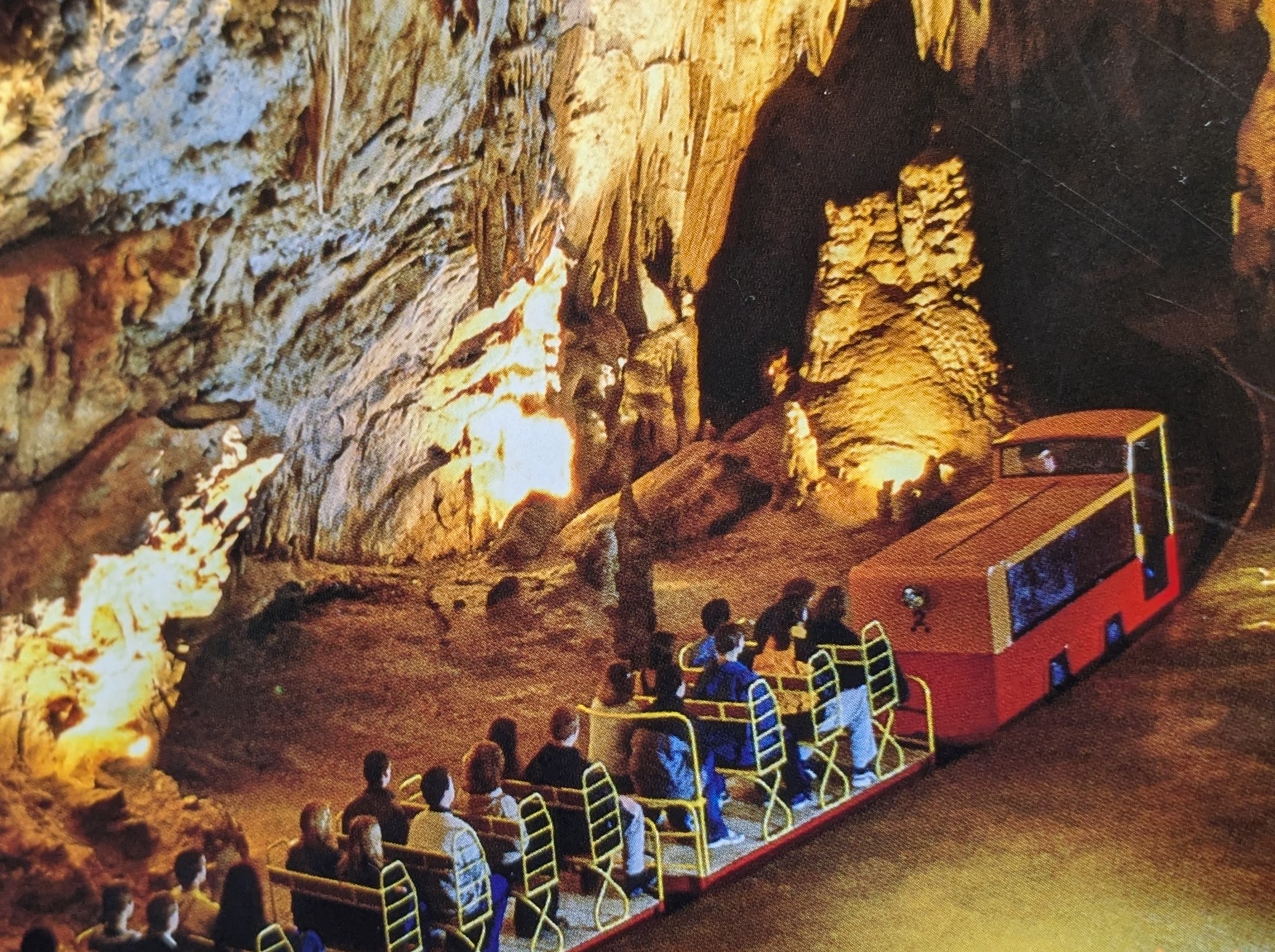 ポストイナ鍾乳洞の最大の特徴は,世界で唯一観光用の鉄道(電動トロッコ)が敷設された鍾乳洞であるということで、約140年前に導入された。現地で購入したガイドブックによれば,当初は手押し車,1914年にガソリン機関車(ウィキペディアでは1924年に蒸気機関車と書いてある)。1957年に電化され,現在は二線軌道になり電動機関車が30分ごとに運航され,一日に1万4千人を運んでいるという。観光ルートは全長5.3kmで、そのうち3.2kmを電動列車で、残り1.8kmを徒歩で巡ることができる