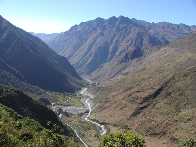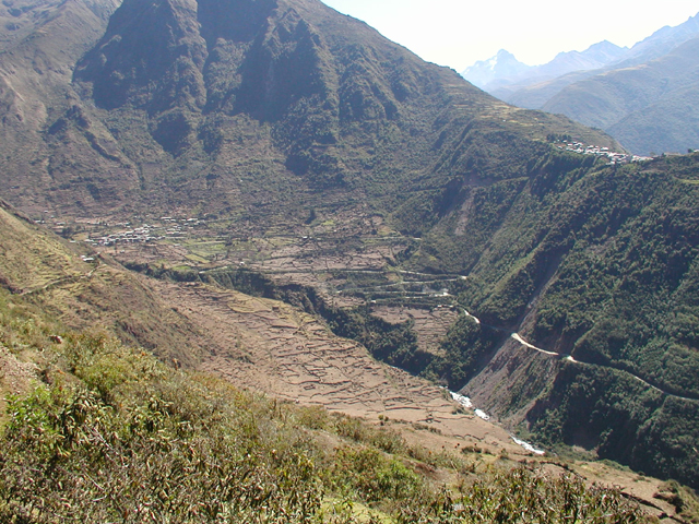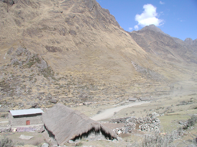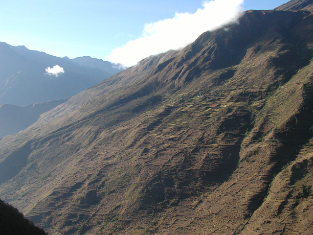 写真4 ワヤワヤ峠から少し下って,標高4000mくらいから標高3000mくらいまでの高度帯にはジャガイモの耕地が広がる。先住民は耕地周辺に出作り小屋を設け,栽培方法や収穫期を異にする多様な品種を栽培している。 |