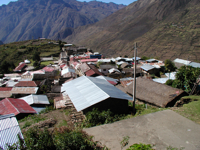 写真5・写真6 マルカパタ村の中心地であるプエブロ・マルカパタは標高3100m付近に位置する。この付近の地形はアラス川が侵食してつくった深い峡谷となっており,狭い尾根や地すべり移動体の上に集落がみられる。プエブロの住民の多くはメスチソである。先住民はこれより高所に居住し,標高4000mから2000mの区間において耕地の周辺に出作り小屋を設け,標高に応じた農業を行っている。年平均気温は約12℃,年降水量は1100 mmほどである。 |