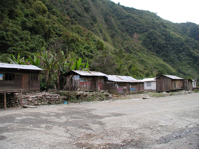 | 写真11 キンセミルを流れるアラス川は,扇状地を開析して網状に流れ,広い氾濫原をつくる。キンセミルの年平均気温は約22℃,年降水量は6000mm以上であり,植生は熱帯雨林の様相となる。 | 写真12 キンセミルにみられる住居は,高温多湿環境を考慮して高床式の住居になっている。この地域では入植者によってコーヒー栽培やバナナの栽培が行われている。 | |||