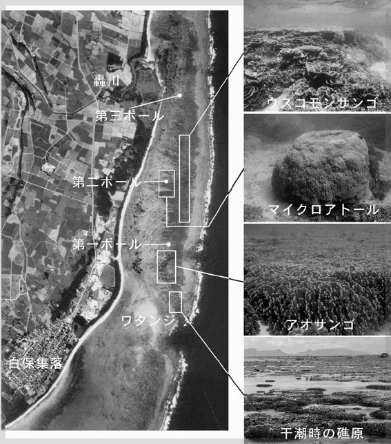 白保サンゴ礁は、石垣島東南岸の宮良湾から東岸の通路川河口まで南北12km、最大幅約1kmにも及ぶ裾礁である。 このうち、見事なサンゴ礁生態系が観察できるのは、白保集落からカラ岳東側までのおよそ7kmの範囲である(空中写真はその南半分を示す)。 ここでは、少なくとも600年以上生き続けている、大規模なアオサンゴ(Heliopora coerulea)群落や、200〜500年程度とみられる巨大な ハマサンゴ(Porites australiensis)の塊状群落やマイクロアトールが多数(第Uポール(後述)周辺だけでも130個以上)分布する。 白保サンゴ礁で見られる造礁サンゴは30属70種以上とみられるが、海藻・海草や魚類など多様な生物も観察できる。浜辺から泳いで外洋に 面した礁嶺まで行くことも可能で、礁池−礁原−礁嶺という地形の帯状構造がよくわかる。また、干潮時には干上がったワタンジ(高まり)を 通って礁嶺まで行くことも可能だ。海上には、かつて空港建設予定地だったなごりの鉄柱(第T〜Wポール)があり良い目印になる。 しかし、安全を考えれば満潮の頃に出るサンゴ見学船(不定期)に乗り、案内人の指示に従ってサンゴを損傷しないように配慮しシュノーケ リングで観察するのが良い。船はアオサンゴ群落、ウスコモンサンゴ(Montipora foliosa)群落、マイクロアトール群やハマエダサンゴ (Porites cylindrica)群落などを巡回する。開発や水質汚濁で健全なサンゴ礁が極めて少ない現状では、白保サンゴ礁の存在価値は大きい。 しかし、近年このサンゴ礁でも陸域の開発行為で赤土(土砂)の流入が著しい。 文献: ・WWFJ(世界自然保護基金日本委員会)(1986):『白保サンゴ礁海域の学術調査報告書』、 第一次白保の海学術調査班、世界野生生物基金日本委員会(現WWFJ)、53P. ・IUCN(1988):『Shiraho Coral Reef』.231P. ・目崎茂和編(1991):『石垣島のサンゴ礁環境』、WWFJ(世界自然保護基金日本委員会)、214P. ・日本自然保護協会(1991):『新石垣空港建設がサンゴ礁生態系に与える影響』、119P. ・WWFJ(世界自然保護基金日本委員会)(1995):『白保のサンゴ礁』、48P.